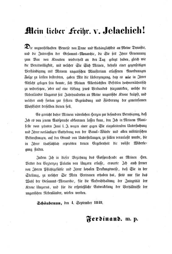 Pismo kralja FERDINANDA banu JELAČIĆU kojim vraća Jelačiću oduzetu bansku čast i vojnu vlast. Schönbrun, 4. rujna 1848., papir, tisak, 39 x 25,5 cm, GMV KPO 8988
